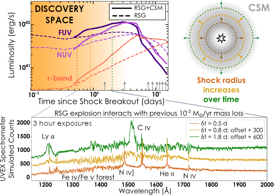 UVEX opens new discovery space for probing stellar mass loss in the final years of a star’s life. The explosion of a red supergiant star surrounded by a dense circumstellar medium (top right) is bright in FUV and NUV (top left). The shock propagates into the circumstellar medium, producing rich, rapidly evolving UV line emission (bottom). Previous observations (gray arrows) have not been early enough to probe this initial spectral evolution.