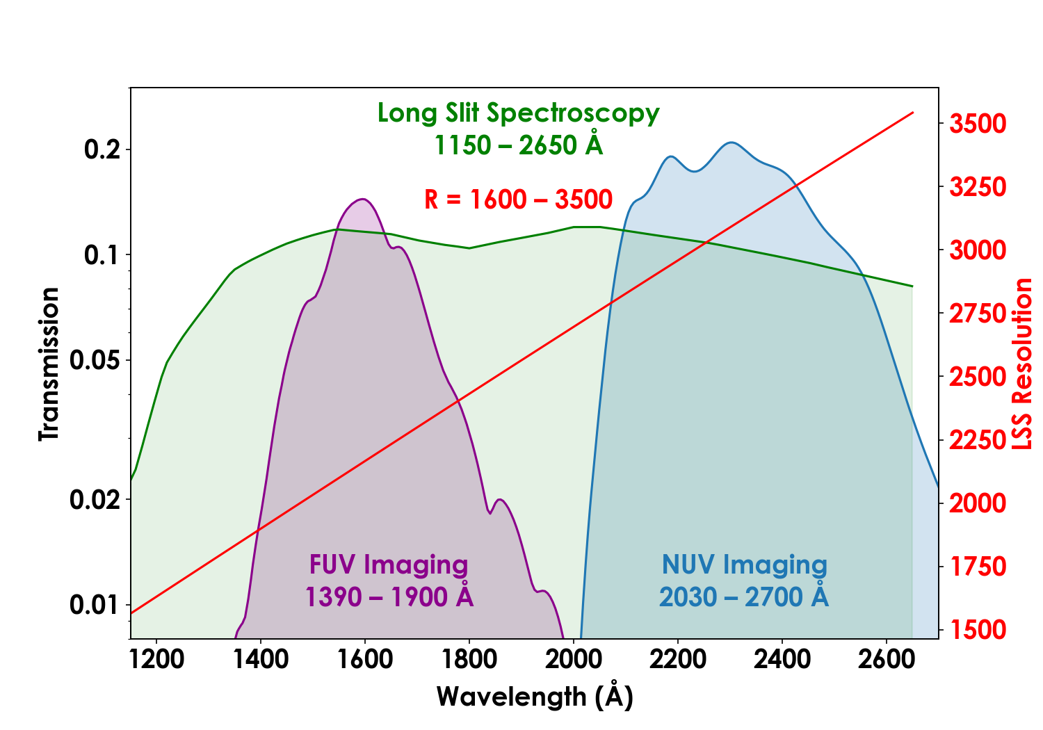 The UVEX NUV and FUV imaging bands have been chosen to approximately match the GALEX imaging bands. The long-slit spectrograph (LSS) provides R>1000 resolution across the entire bandpass, which is optimized for wind features in hot stars and nebular emission lines from low-mass, low-metallicity galaxies.