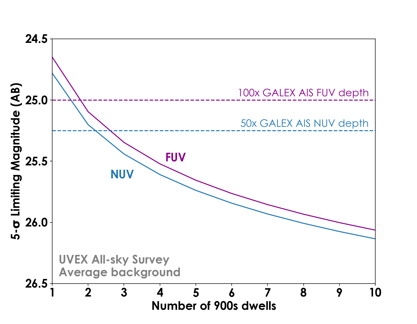 The UVEX 5-sigma limiting magnitude for NUV and FUV for a typical sky background outside of the Galactic Plane, compared with the GALEX All-Sky Imaging Survey depth. The UVEX all-sky survey will be built up from repeated visits to fields over the course of the two-year prime mission.