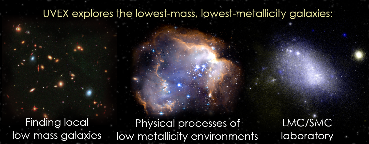 Low-mass (M<109 Msun), low-metallicity (1–50% Zsolar) galaxies dominate the hot, metal-poor early universe, power cosmic reionization, and constitute the majority of galaxies in the local universe. Despite their importance, they remain one of the least explored galaxy frontiers due to their intrinsic faintness and spread across the sky. UVEX will provide a comprehensive census of local, low-mass, low-metallicity (LMLZ) galaxies, which is crucial for understanding how their environments affect their properties. These local LMLZ galaxies are key for understanding the processes of galaxy formation, stellar evolution and demise, and the formation of compact objects in metal-poor environments. UVEX will identify low-mass, low-metallicity galaxies in the nearby Universe, diagnose the nebular emission of analogs to high-redshift galaxies, and study hot and stripped stars in the Large and Small Magellanic Clouds, our neighboring low-metallicity laboratories.