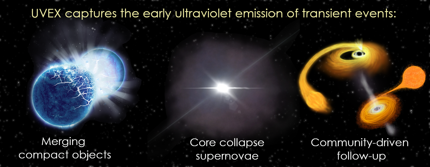 A golden era of time-domain and multi-messenger astronomy is upon us as new, panchromatic observatories such as SKA and Rubin become operational, and upgrades to LIGO and Virgo expand our capacity to detect gravitational wave events. We expect these observatories to identify hundreds of thousands of transients and open up a tremendous discovery space. UVEX’s rapid imaging and spectroscopic follow-up will provide a vital new window on the dynamic universe by probing the short-lived UV emission from merging neutron stars, performing spectral follow-up of the first hours of core collapse supernovae, and providing a community resource for target-of-opportunity observations.